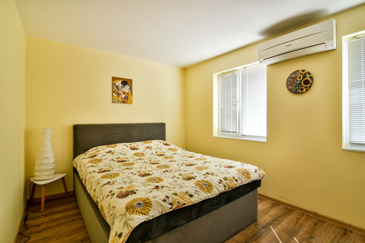 Budget-friendly studio for 2 in quiet villa area near Saint Constantine & Helena. Cozy 2nd-floor flat with double bed, kitchenette, private bathroom, shared garden. Free street parking, Wi-Fi, AC, TV. Ideal for couples or solo travelers seeking peaceful nature + resort proximity.